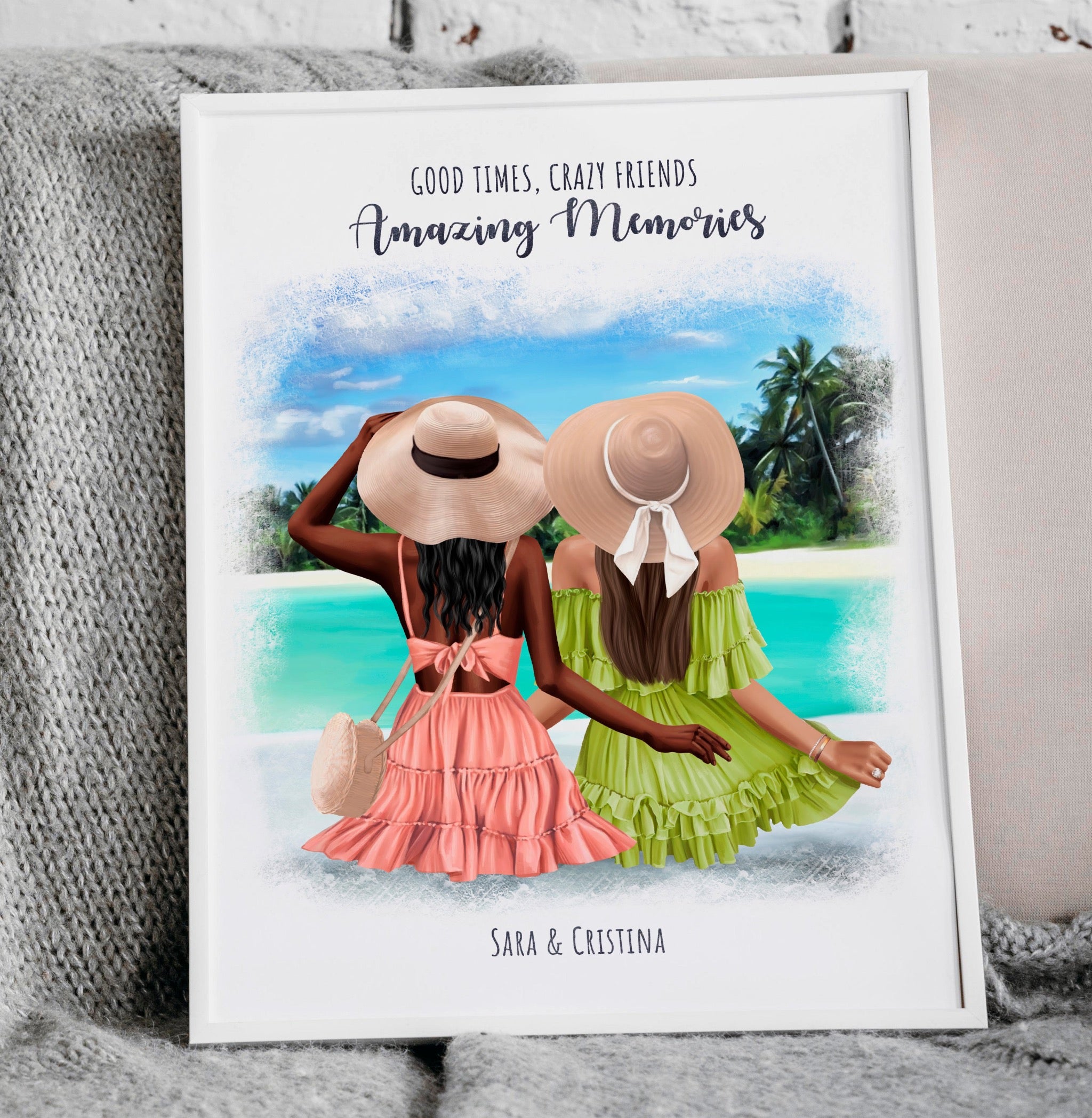 Custom Best Friends print that will make the best gift for your friends, bridesmaids, bride, family members and any special person in your life. A perfect gift for any occasion to express your love for your besties. You can personalise this print by selecting the hairstyles, skin colours, dress colours, and more. Customisations can be specified by selecting the options offered before adding the design to your basket, or we can discuss everything by email at info@saradebono.com