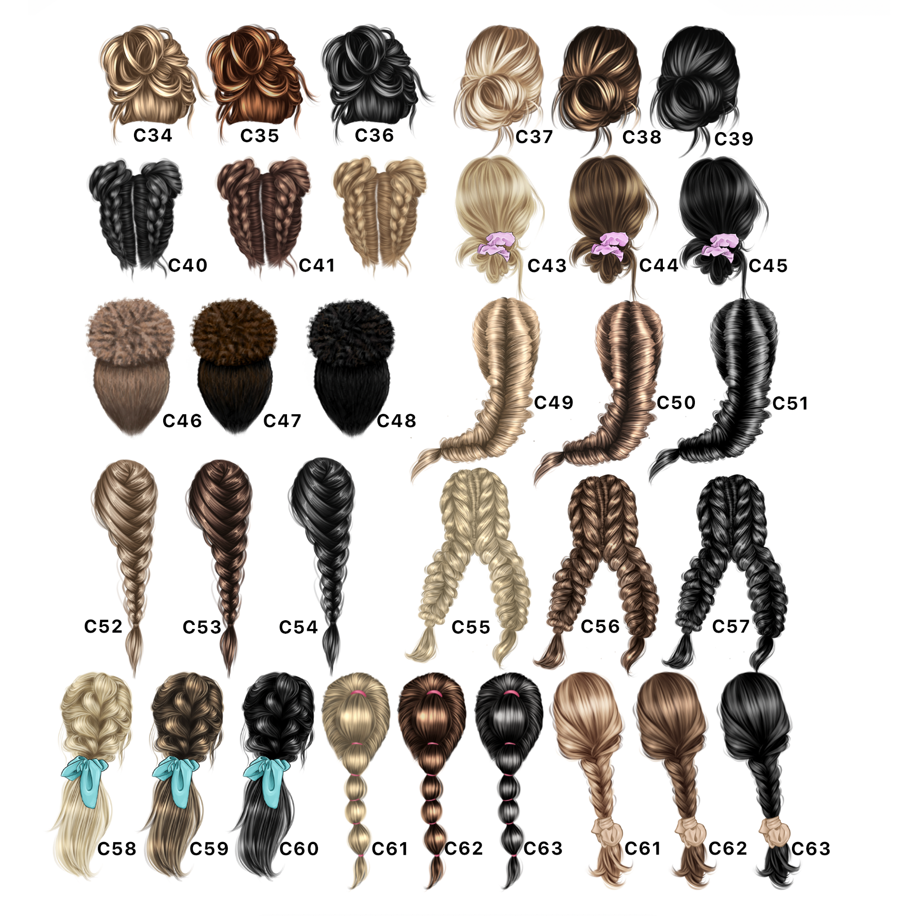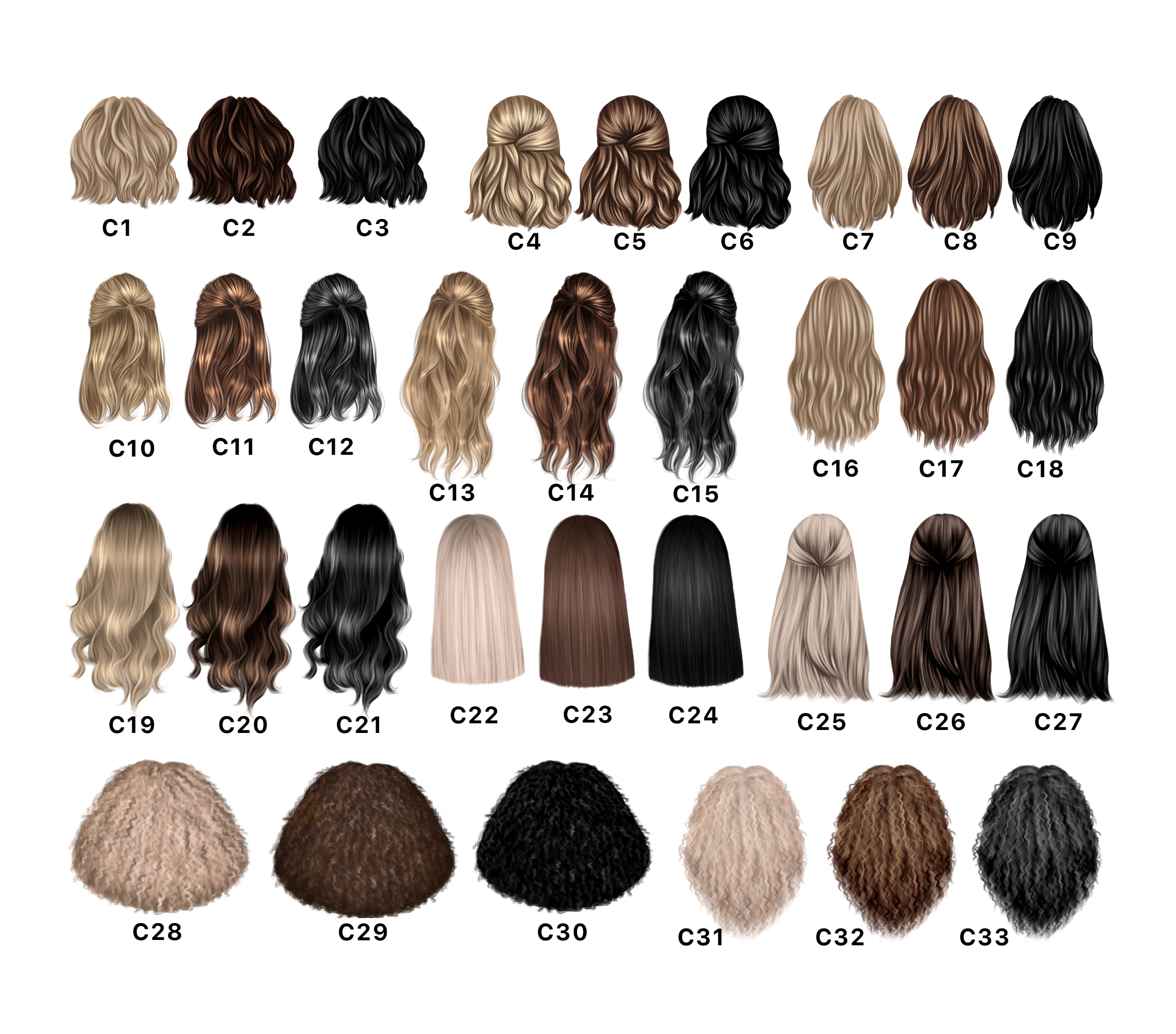 Personalise your design by selecting the options that you will find next or under the gallery, depending if you are using a laptop or a mobile device. Check the photos 2 and 3 to select the haistyles and bottoms.