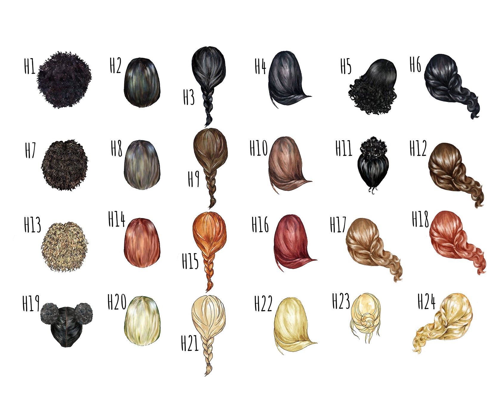 You can personalise the hairstyles, jackets, bottoms, accessories and the sentence. You can eithes select the different options offered and filling in the personalisation boxes, or we can discuss the design via email to info@saradebono.com
